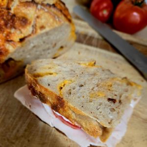 A savory delight with a rich, cheesy twist. Infused with sharp cheddar cheese, it boasts a golden crust and a tender, tangy crumb that perfectly complements the bold flavor of the cheese.